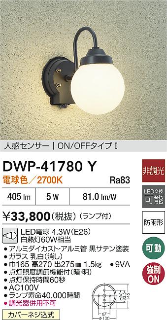 ホーム(トップページ) >> DAIKO LED屋外シーリングライト DWP-41780Y
