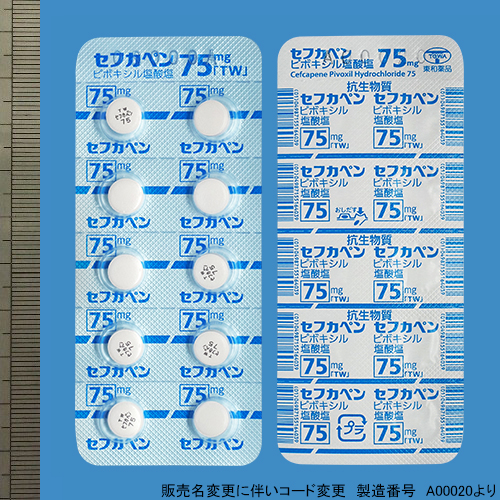 有効成分(一般名) | セフカペン ピボキシル塩酸塩水和物 | 規制区分 | 局処 | 使用区分 | 内用薬 | 規格/包装単位 | 75mg/錠 PTP 10錠×10 | 販売包装単位コード | 14987155164067 |