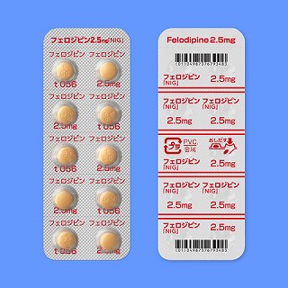 有効成分(一般名) | フェロジピン | 規制区分 | 劇局処 | 使用区分 | 内用薬 | 規格/包装単位 | 2.5mg/錠 PTP 10錠×10 | | 販売包装単位コード | 14987376793428 |