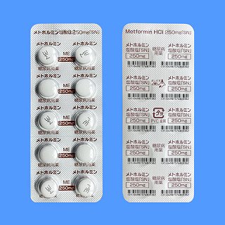 有効成分(一般名) | メトホルミン塩酸塩 | 規制区分 | 劇局処 | 使用区分 | 内用薬 | 規格/包装単位 | 250mg/錠 PTP 10錠×10 | | 販売包装単位コード | 14987376809327 |