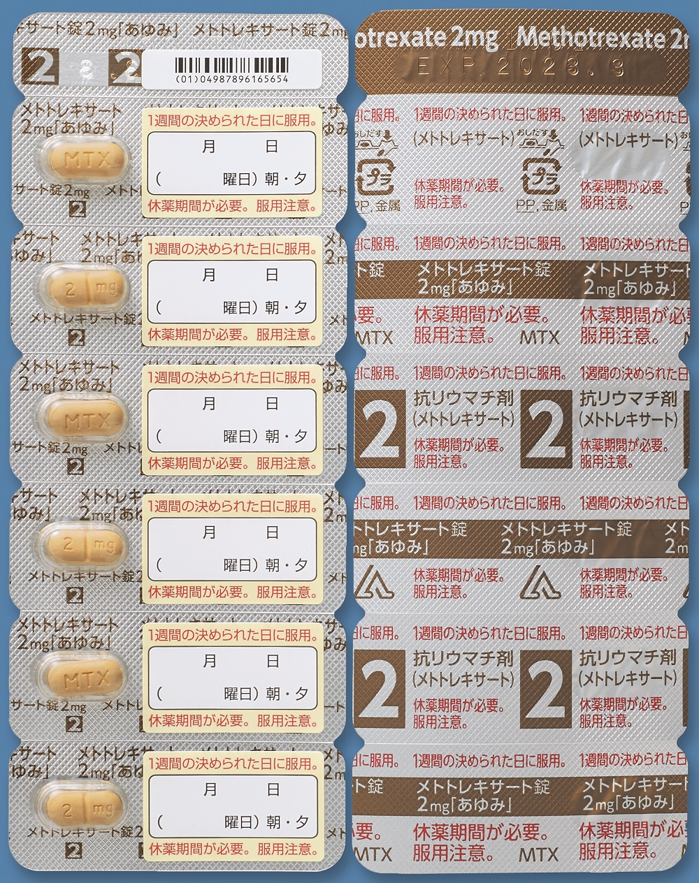 有効成分(一般名) | メトトレキサート | 規制区分 | 劇処 | 使用区分 | 内用薬 | 規格/包装単位 | 2mg/錠 PTP 6錠×8 | | 販売包装単位コード | 14987896165637 |