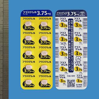 有効成分(一般名) | プラスグレル塩酸塩 | 規制区分 | 処 | 使用区分 | 内用薬 | 規格/包装単位 | 3.75mg/錠 PTP 10錠×10 | | 販売包装単位コード | 14987155164227 |