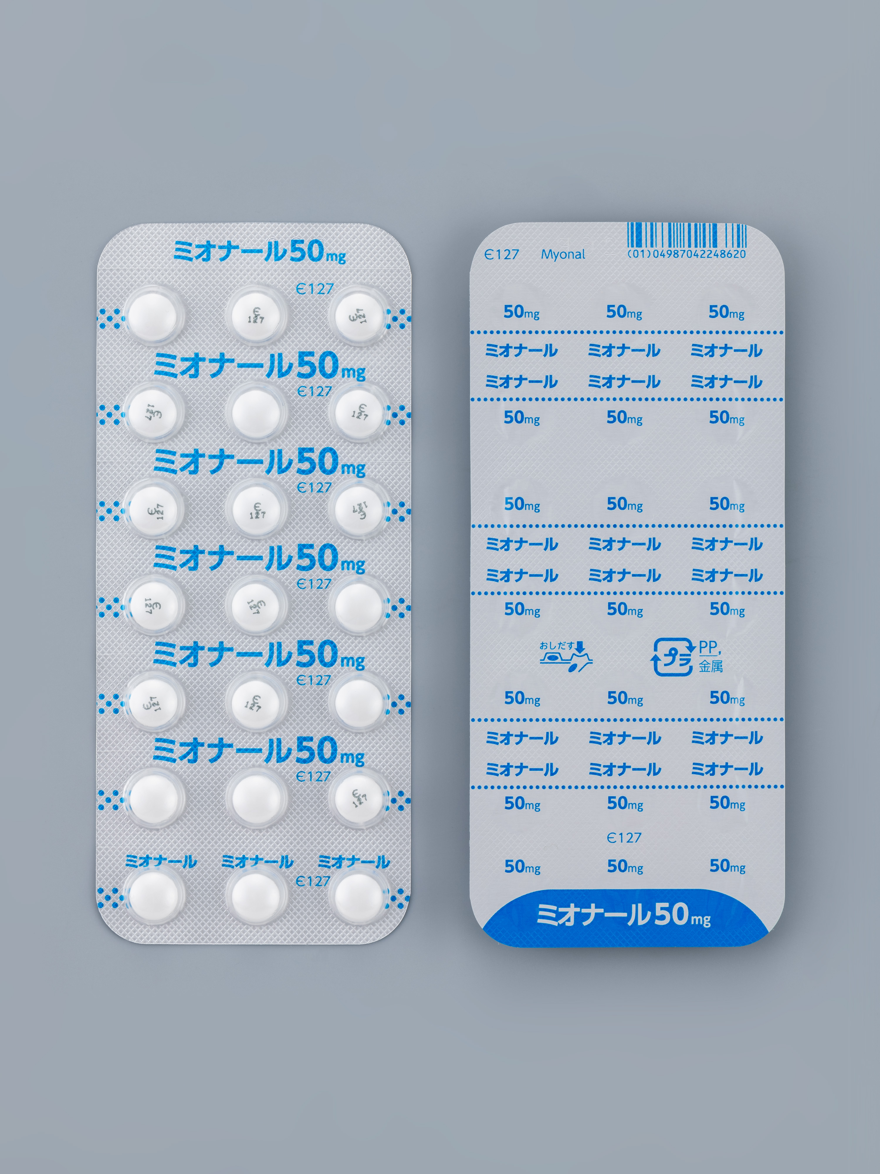 有効成分(一般名) | エペリゾン塩酸塩 | 規制区分 | 処 | 使用区分 | 内用薬 | 規格/包装単位 | 50mg/錠 PTP 21錠×10 | | 販売包装単位コード | 14987042248122 |