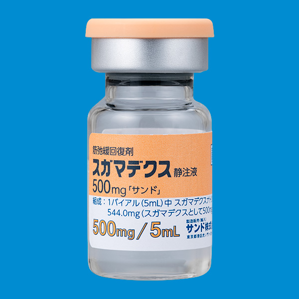 有効成分(一般名) | スガマデクスナトリウム | 規制区分 | 処 | 使用区分 | 注射薬 | 規格/包装単位 | 500mg5mL1瓶×10瓶 | | 販売包装単位コード | 14987614442309 |